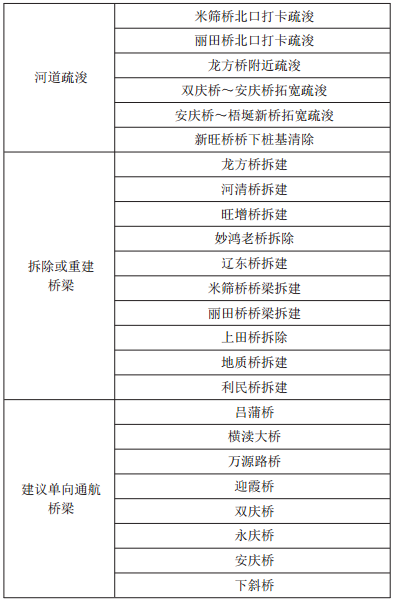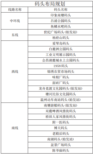 该规划结合沿线景点布置和现场调查,游船码头共布置25个,其中世纪广场码头、龙舟竞渡文化园码头、温州动车南站码头、南塘游船码头、南湖码头等5个为始发站码头,作为今后游船运营公司的补给基地,印象南塘码头、杨府山码头、白鹿洲公园码头、梧田人家风情街码头等20个为停靠点码头。今后游船运营公司可以根据这25个码头,设计多条游船游览路线,游客们可以从这25个码头乘坐游船。“一环三线”航道内有10座桥梁需要拆除或重建,8座桥梁建议单向通航,有5处河道进行疏浚(见表格)。