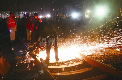 温州网讯 今天零时许,金丽温铁路温州段铺轨工作迎来最后攻坚工程——铁路温州南站1公里的换轨作业。