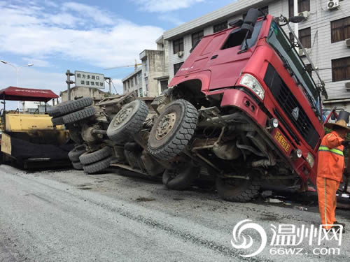 温州网讯 8月11日下午3时许, 104国道鳌江长庚医院前路段正在施工封道,满载沥青的货车准备卸下沥青铺设路面,没成想刚准备升起货车后斗,结果就“崴脚”,车子侧翻了。