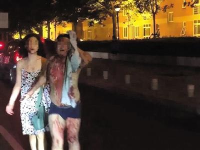 爆炸地点附近,能见度很低,路人相互搀扶离开现场。