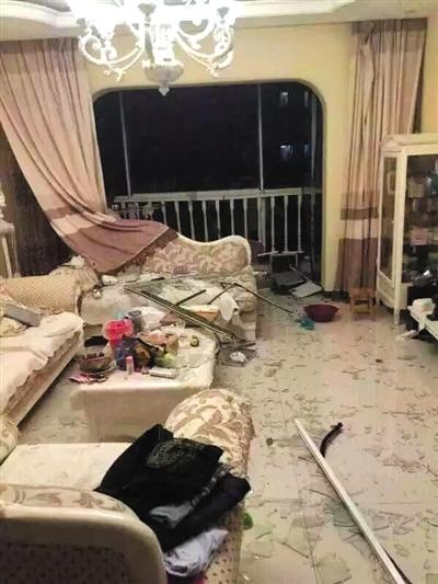在一户居民家中,靠近阳台的落地窗完全破碎。