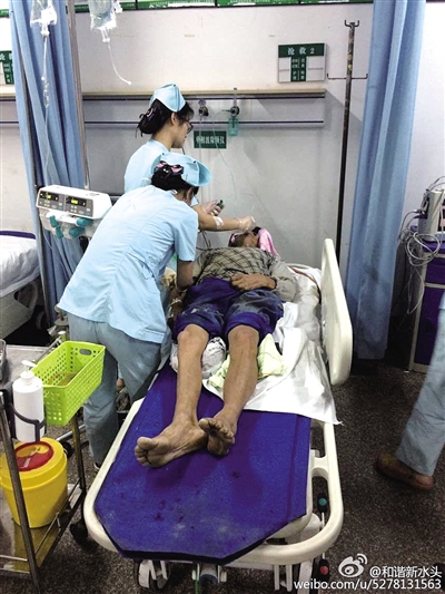 温州网讯 今年50岁的孔继衷是水头镇一名普通的环卫工人。从12日中午12点半开始,他像往常一样在水头镇大转盘附近道路清扫淤泥和垃圾。因为连日奋战,下午2点半左右,他因体力不支晕倒在工作岗位上,随即被救护车送往医院,目前正在水头的平阳第二人民医院急诊室诊治(如图)。
