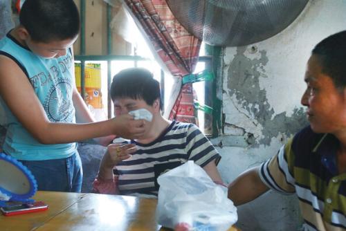 今年12岁的林杰是洞头县霓屿街道布袋岙村人,下个月就要上初一了。2009年,林杰的母亲柯爱霞从一个山坡上摔下来,颈椎出现问题,手术后留下后遗症:四肢无力,口齿不清,头不能自由转动,只有左手能稍微活动一下。由于父亲常年在玉环打工,照顾母亲的事情只能由林杰来做。他每天早上要帮妈妈穿衣服、洗漱、上厕所,下午放学回家后要烧饭、照顾妈妈吃饭、洗碗,还要给妈妈洗脸、洗脚、按摩、清理大小便。林杰说,照顾妈妈是他的责任,他的最大心愿就是妈妈能尽快好起来。