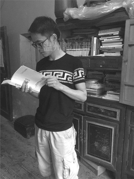 昨日,瑞安市湖岭镇林源村,在林国敬简陋的二楼住房里,一块红色奖牌放在显眼的位置,上面写着:祝贺林国敬同学考取博士研究生,奖金10000元。落款是瑞安市人民教育基金会。一个不大的书柜中,中国人民大学哲学专业博士研究生的录取通知书,与哲学方面的书籍放置一起。