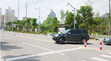 随后,记者来到现场看到,该路段的护栏看起来很新,其中有八段护栏横在绿化带旁,有两三段护栏已变形。由于中央护栏缺失,马路中央露出20余米的开口,不少车辆经过时随意调转车头进出市公安局出(入)境接待大厅。