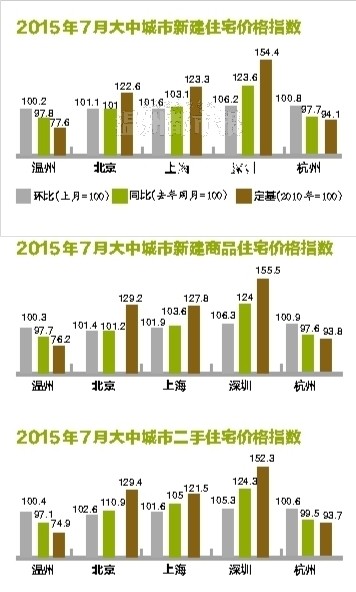 温州网讯 昨天,国家统计局公布的“2015年7月份70个大中城市住宅销售价格变动情况”显示,70个大中城市房价环比上涨的个数继续增加,涨幅已连续4个月“翻红”,京沪深房价均超去年同期。 温州新建住宅价格指数环比上涨0.2%,同比下降2.2%;新建商品住宅价格指数环比上涨0.3%,同比下降2.3%;二手住宅价格指数环比上涨0.4%,同比下降2.9%。专家认为,未来全国整体房价将保持总体平稳,不会出现过快上涨。