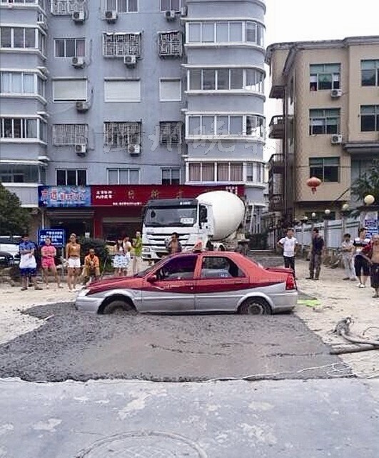 据附近的目击者称,这辆出租车真的是“杯具”了,差不多半个轮子都陷进了水泥,进退两难,车上还有几名乘客,驾驶员是个女的,也不知道怎么开进去的。