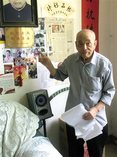 在吴尚志苍南的老家,记者留意到,客厅四周的墙壁上贴着他书写的家风家训和一些与抗战有关的资料、图片。其中有一篇便是他听闻日本宣布无条件投降有感而发写下的:“八年抗战惯征鞍,枪林弹雨习犯难。热血忠心勤国事,深思熟虑惜民残。百年痛尽英雄泪,一代春回古杏坛。弘扬我武开新境,且教列强拭目看。”