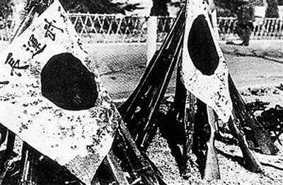 中国军队缴获的日军旗帜和武器。
