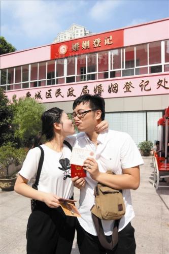 ▲昨日,在鹿城区民政局婚姻登记处,一对刚领完结婚证的新人在秀恩爱。记者黄攀/摄