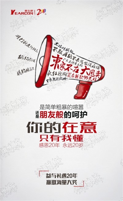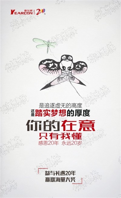 “20年意路同行中,你有踏实梦想的厚度么?你有在乎身心的舒适么?你有得到朋友般的呵护么?你所在意的,意尔康都懂。”日前,意尔康在其官方微博上发布了一组品牌20周年庆生海报,以“在意”为主题宣传“感恩20年,永远20岁”。海报画风幽默,文字励志,文艺范十足引来一片点赞声。