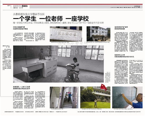 永嘉县鹤盛镇东皋小学霞家岙校区地处永嘉偏远山区,有78年办学历史。但到了2012年9月,学校只有一名学生、一名教师。3年来,教师周志浩承担着语文、数学、科学、美术和品德5门功课的教学工作,但英语课只能让学生看书,体育课只能让学生自己玩。