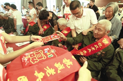 温州网讯 连日来,温州各地纷纷以不同形式,开展关爱抗战老兵系列活动,送去温暖,送上祝福。图为昨天上午,永嘉关爱老兵志愿服务中心邀请该县23名抗战老兵齐聚县城,为他们披上荣誉绶带,送上慰问金和祝福。
