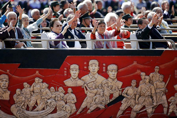 9月3日上午,抗战老兵和抗日英雄子女乘车方队驶过天安门广场。
