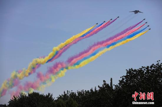 9月3日,纪念中国人民抗日战争暨世界反法西斯战争胜利70周年大会在北京隆重举行。图为空中梯队飞过天安门广场。中新社记者刘震摄