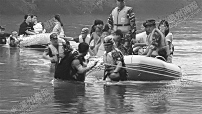 昨天清晨5点30分许,现场唐小义等人配带好装备,历时20多分钟在河道两边接好了一条长达150米的救生索后,又用主锁扣住两艘橡皮筏,赶到对岸,先将被困的妇女儿童接到橡皮筏上,再涉水将橡皮筏拉到安全地带。“一共两艘橡皮筏,先后往返了6个来回,才将被困的人员救出。”唐小义说,至昨天上午9点40分许,被困人员全部被救出。