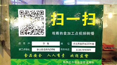 农贸市场管理日益规范化,市场内干净的环境、整洁的窗口、齐全的“三防三白”设施受到消费者的肯定,但是光鲜亮丽的外表是否能够真实反映所售食品的安全性呢?特别是市场内的熟食,其加工过程是消费者看不到的,加工点的环境卫生好不好,加工的过程规范不规范,加工时有没有非法添加,这些都是消费者关心的食品安全问题。“扫二维码,看加工点实况”新举措,还规定二维码下方还对应标注经营户的加工地址、负责人姓名、联系电话等内容,可随时接受广大消费者及监管部门的监督,以此推动经营户自觉做好加工点的环境保洁、设施维护、程序规范,以保障食品安全。