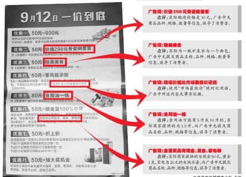 在“一价到底”的广告单中,还包含一项优惠活动,“砸金蛋100%中奖,金蛋奖品有现金、黄金、家电等……”不少消费者看到这些字眼误以为价值不菲。“其实所谓的奖品中,‘现金’为50元,‘黄金’为1克,‘家电’只是26元的电热水壶,很容易误导消费者。”执法人员介绍,按照新《广告法》第八条第二款规定,广告中表明推销的商品或者服务附带赠送的,应当明示所附带赠送商品或者服务的品种、规格、数量、期限和方式。