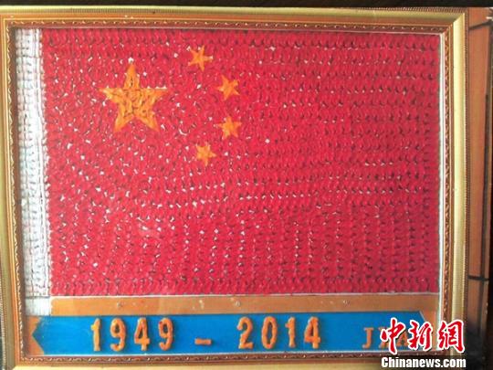 新疆富蕴县杜热镇杜热村哈丁·胡家哈盘老人耗时一年多的时间,用1540个羊拐骨拼出了国旗和新疆维吾尔自治区地图,向祖国65周年华诞、新疆维吾尔自治区成立60周年献礼。