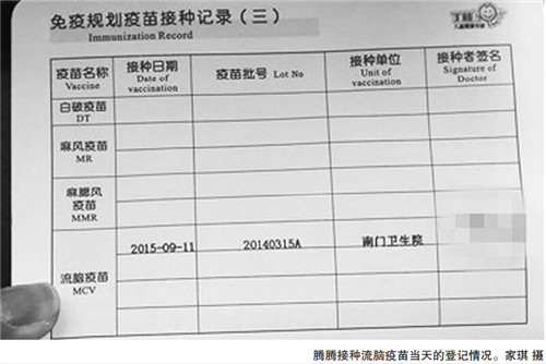 在严女士提供的预防接种证上,记者看到腾腾从5月15日开始接种了三种不同的疫苗,而流脑疫苗是她接种的第四种疫苗。据了解,流脑疫苗需要在孩子六足月时接种,腾腾符合相关的接种时间规定。