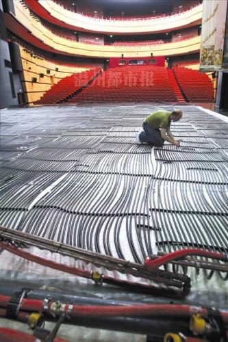 3、在隔水膜上铺上冷凝管。这是整个步骤中最重要的环节,300多条冷凝管布满整个舞台,并与停在剧院后门的集装箱用两根管道相连接,制冰开始时,位于集装箱内的压缩机开始工作,为冷凝管来回输送氟利昂,保持冰面温度在零下20℃;
