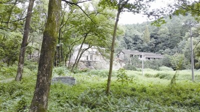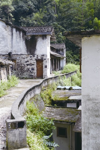 渡口石阶上,一条白色小狗正好奇地注视着前来的陌生人。一条通村的小路,道路两边长满了野花和野草,还有众多的大樟树。行走数十步,树林中隐约可见2幢石砖混砌的老房,外墙斑驳。村前是一空旷的平地,这里杂草丛生,与前边的几百棵大树,将小村隐蔽在丛林中。