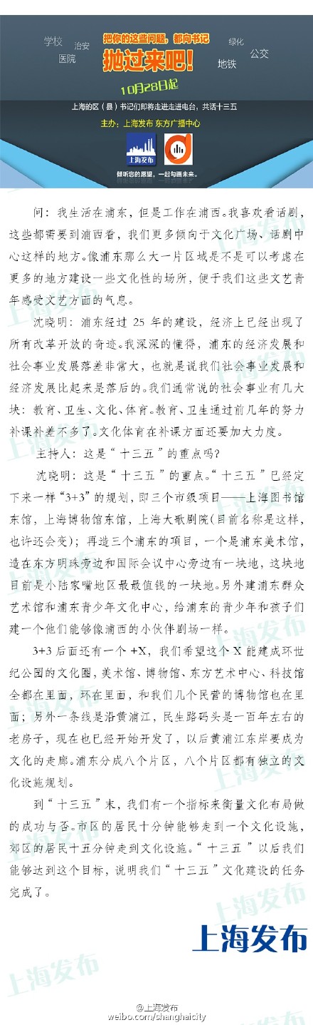 东方网10月28日消息:今天中午12:00,上海市委常委、浦东区委书记沈晓明作客FM93.4、AM990《市民与社会》谈未来5年浦东发展。