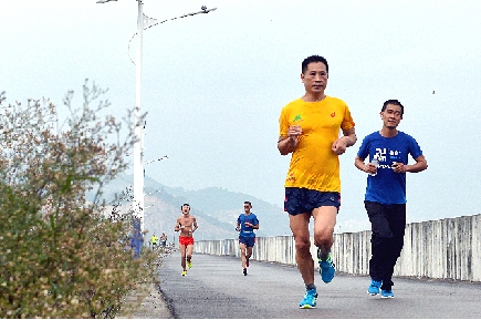 温州网乐清支站讯 昨日上午,雨止转阴,乐清胜利塘堤坝上海风轻拂,近20名跑友聚集一起跑马拉松,上演了精彩的“速度与激情”。