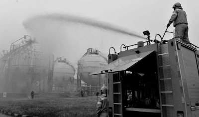 (记者王硕)“2号汽油储罐进料阀泄漏,泄漏量较大,请求支援。”昨天下午,某大型化工厂仓储区工人在巡检时,发现一汽油储料罐发生泄漏,10吨汽油泄漏进入围堰,处置人员在收油过程中,因静电引发泄漏汽油着火爆燃,1人受伤,1人情况不明……这是北京市环保局组织的2015年突发环境事件应急演练中上演的“惊心”一幕。