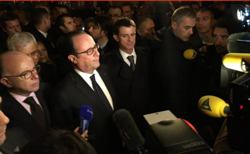 奥朗德当晚11点55分发表电视讲话,宣布动员一切力量保卫法国。总统宣布全国进入紧急状态,关闭边境,允许抄家。法国军队目前已进入巴黎大区。奥朗德解释说,这样做是为了预防新的恐怖袭击发生。
