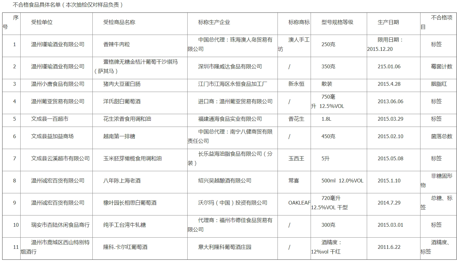 此次共抽取进口食品、红酒、食用油等样品共114批次,其中不合格11批次,不合格率为9.6%。