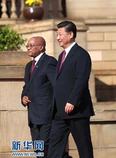会谈前,祖马在联邦大厦广场为习近平举行隆重欢迎仪式。中南两国国旗迎风飘扬,仪仗队戎装肃立。习近平和夫人彭丽媛抵达时,受到祖马总统和夫人热情迎接。两国元首登上检阅台,军乐队奏中南两国国歌,鸣礼炮21响。习近平检阅仪仗队。