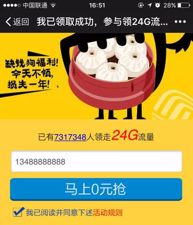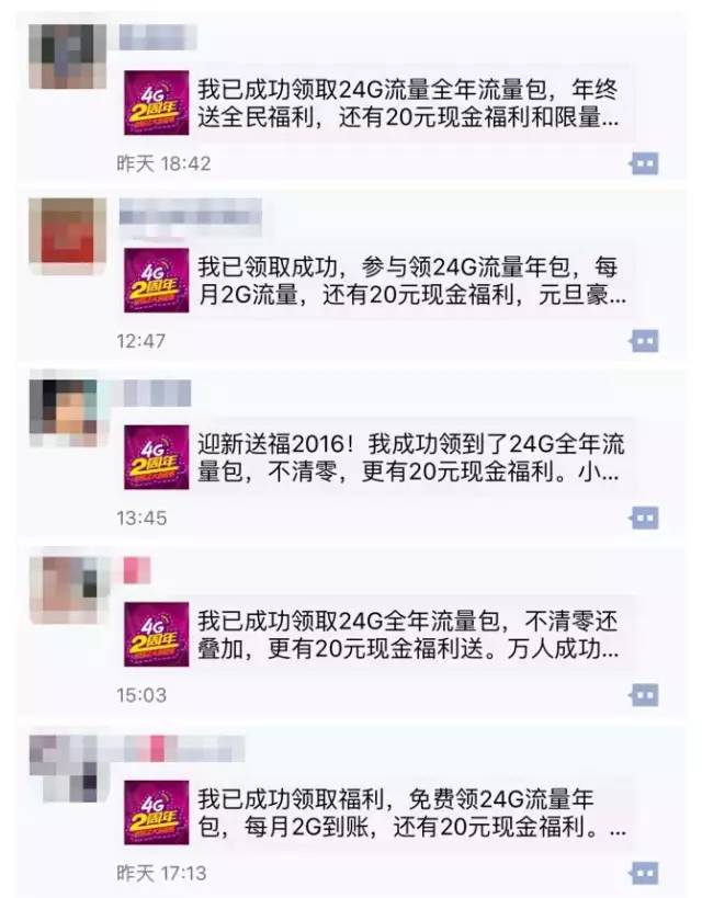 该骗局的内容基本上一致,都是24G流量免费送,让你填写手机号,然后再诱导你分享到朋友圈,不管你的手机号是哪个运营商。
