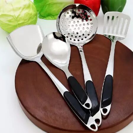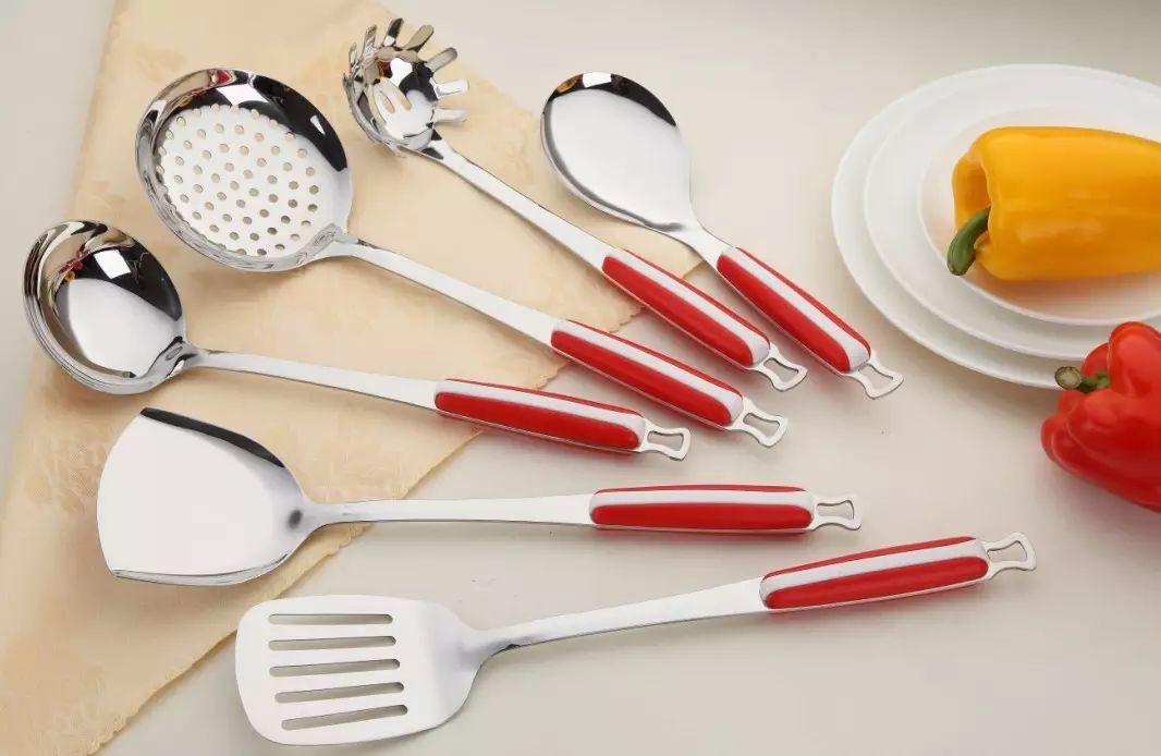 一般按材料可分为木柄锅铲、铁柄锅铲、不绣钢锅铲、硅胶锅铲。