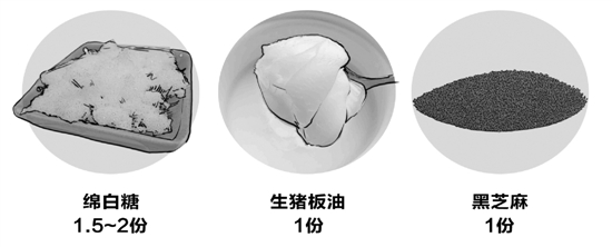 绞碎的生猪板油和芝麻沫子混合,加入绵白糖。
