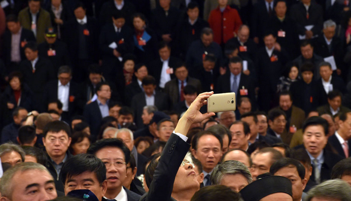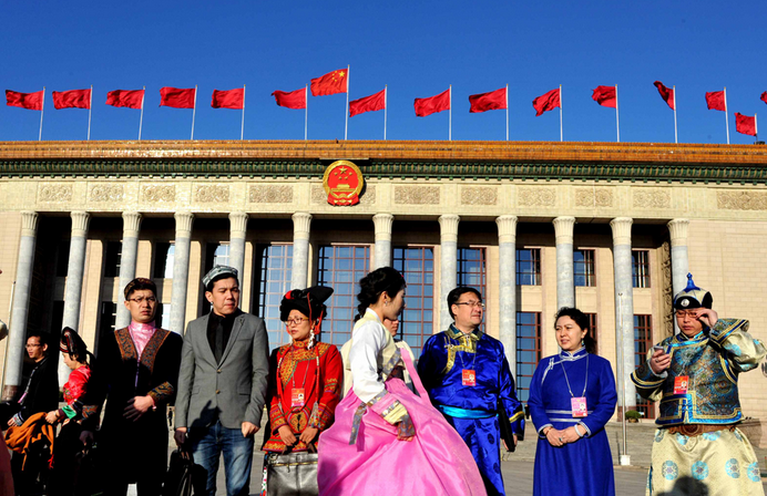 3月13日,十二届全国人大四次会议在北京人民大会堂举行第三次全体会议。会后代表委员走出会场。 中新社记者 金硕 摄