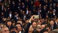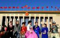 3月13日,工作人员在人民大会堂前合影。当日,十二届全国人大四次会议在北京人民大会堂举行第三次全体会议。 中新社记者 王东明 摄