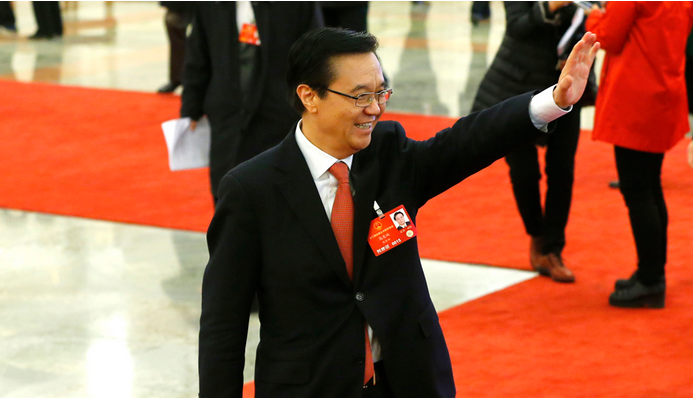 3月13日,十二届全国人大四次会议在北京人民大会堂举行第三次全体会议。商务部部长高虎城在两会“部长通道”接受记者采访。 中新社记者 富田 摄