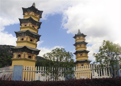 在钱仓凤山南麓,矗立着宝胜寺双塔,历经千年风雨,成为钱仓历史文化的标志。据历史记载,双塔建于宋乾德三年(965)。两塔大小相同,系六面五级,实心的砖塔,高16米,塔基直径约4米,两塔相距11.8米,均有倾斜。两塔每层壶门内各有佛龛,龛内原各有泥浇佛像一尊,姿态各异。1963年列为浙江省重点文保单位。