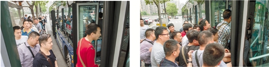 场景二:一拥而上。公交站台上下都挤满了乘客,当公交车快要进站时,候车人群已经蠢蠢欲动,越来越多的乘客走下站台,朝着车子开来的方向涌动,司机不敢将车辆靠得太近。车辆还未停稳,公交车门前已经挤满了乘客。车门一打开,一高大的小伙子便利用身高优势,挡到了门前,待他上车后,后面的人并没有紧跟其后,因为,一哄而上的乘客堵住了车门,大家相互推搡着:“踩我脚了!”、“包,你拽住我的包了……”