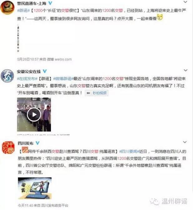 辟谣君在网上搜索发现,上海、重庆、安徽、山西、四川、陕西等全国多地都出现了“山东1200交警支援严查酒驾”的不实信息,已被当地交警辟谣。