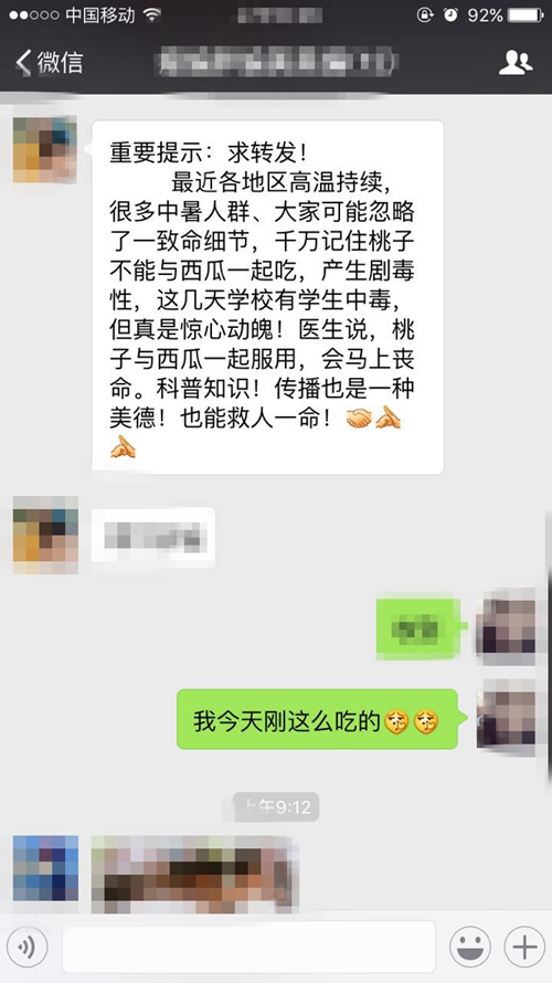传言称:最近各地区高温持续,很多中暑人群、大家可能忽略了一致命细节,千万记住桃子不能与西瓜一起吃,产生剧毒性,这几天学校有学生中毒,但真是惊心动魄!医生说,桃子与西瓜一起服用,会马上丧命。科普知识!传播也是一种美德!也能救人一命!