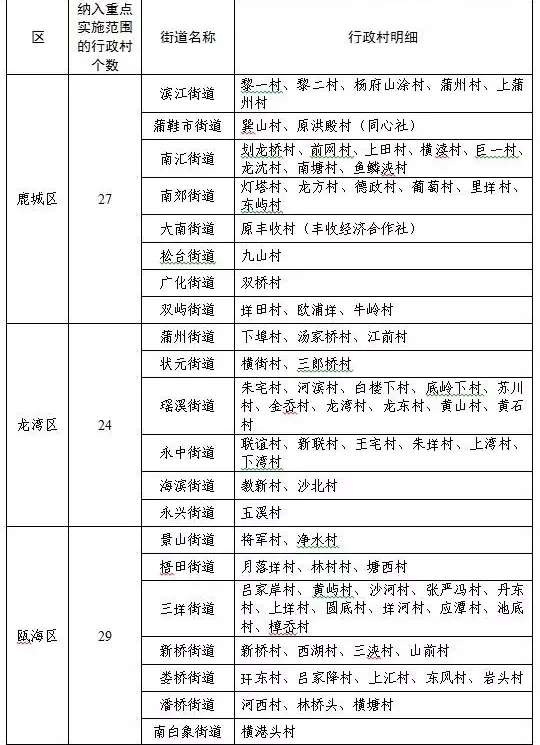 鹿城区范围重点对滨江、蒲鞋市、南汇、南郊、大南、松台、广化、双屿8个街道的27个行政村实施拆迁改造;龙湾区范围重点对中心区、状蒲片和浙南科技城的24个行政村实施拆迁改造;瓯海区范围重点对中心区、中央绿轴、梧田街道、景山街道、三垟湿地及动车南站以东区域29个行政村实施拆迁改造。