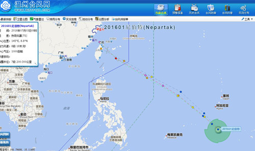 今年第1号台风“尼伯特”(热带风暴级,英文名:Nepartak;名字来源:密克罗尼西亚;名字意义:著名的勇士)于7月3日上午8点钟在美国关岛以南的西北太平洋洋面上生成,其中心位于我国台湾台北东偏南方约3070公里,北纬8.8度、东经145.0度,8级(18米/秒),1000百帕。据温州台风网信息,早上8时该台风距离温州3326公里。