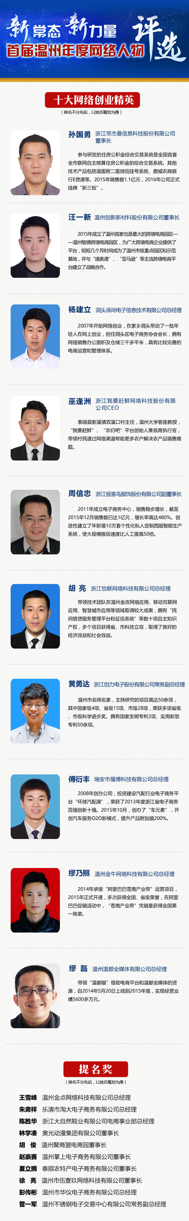 温州网讯 为提高民众的网络发展意识,挖掘展示一批温州网络界各领域先进典型,展示我市网络从业人员的新风采、新面貌,激发全市人民开展“互联网+”创业创新的热情,推进形成良好的网络风尚,三月中旬,由市委宣传部、市网信办、市文明办、市经信委、市科技局、市公安局、市人社局、市商务局、市文广新局、市金融办、市经合办、团市委、市文联、温州日报报业集团、温州广电传媒集团共同开展首届“温州网事·助力发展”年度网络人物评选活动。经资格审查、媒体公示、网络投票和评委会审核评定,共评选出王进权等60名同志为“温州年度网络人物”,现予以公布。