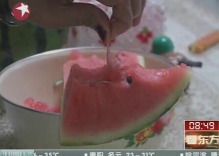 真相:其实针头真的很难插进西瓜。用力太小,针头都无法穿透西瓜皮,用力过猛,西瓜就裂开了。而且,这些注射液很难在西瓜内均匀扩散:另外,给西瓜戳一针,针孔对西瓜而言就是伤口了,最可能的结果就是瓜还没卖掉就烂掉了。其实,那些黄白色的部分主要是一些纤维结构,有些是品种问题,有些则可能是因为生长过程中外界环境不适造成的,比如温度过低。