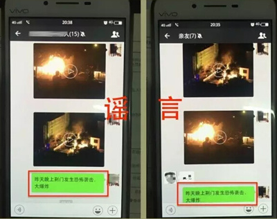 7月8日,网民“一米阳光”在某微信群里发布消息称,“昨天晚上湖北荆门发生恐怖袭击,大爆炸”,文中附有一段爆炸起火的视频,此消息迅速引起网民关注,并被大量转发。