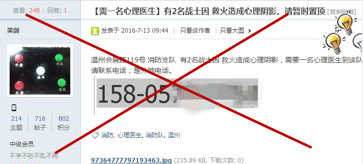 7月13日,有网民在温州本地某论坛上发布一则“【需一名心理医生】有2名战士因救火造成心理阴影”的网帖,内容称,温州消防支队,有2名战士因救火造成心理阴影,需要一名心理医生到该队援助。帖文称援助有费用,并留下一个外地号码:158****9754。