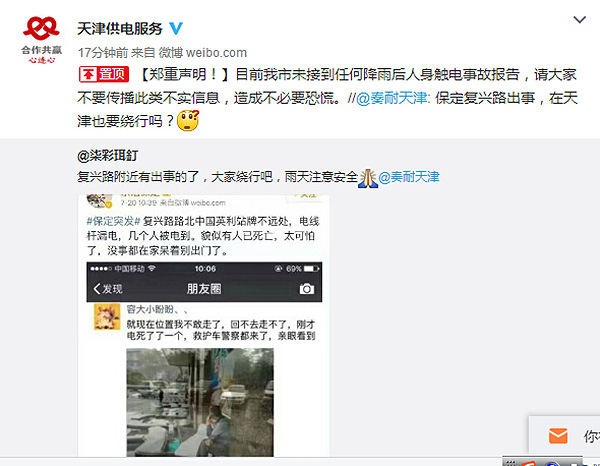 目前,天津市电力公司已在官微发表声明:“目前天津市未接到任何雨后人身触电事故报告,请大家不要传播此类不实信息,造成不必要的恐慌。”