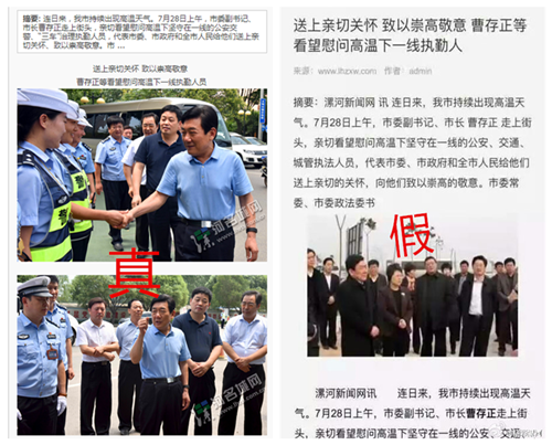 近日,漯河新闻网发布的一则关于漯河市领导看望慰问高温下坚守一线执法人员的新闻配图在网上引起热议。记者查证,该配图实为2013年3月该市相关领导视察舞阳县时的旧图,并非此次“高温慰问”的实际照片,漯河新闻网的图片系移花接木。